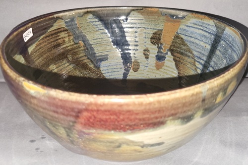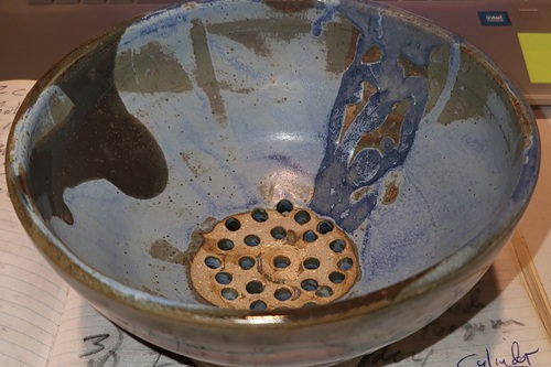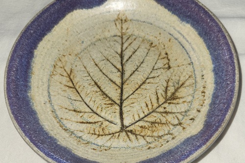 Unique bowls annd plates with decorations including appliques created with actual leaves, unique carvings and interesting glazes.