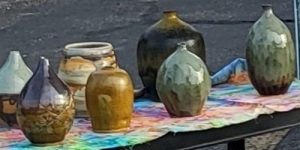 Open stoneware containers of various sizes and shapes including cylinder vases, bud vases, trumpet vases, bottle vase and bowl vases. Various decorations including appliques created with actual leaves, unique carvings and interesting glazes.